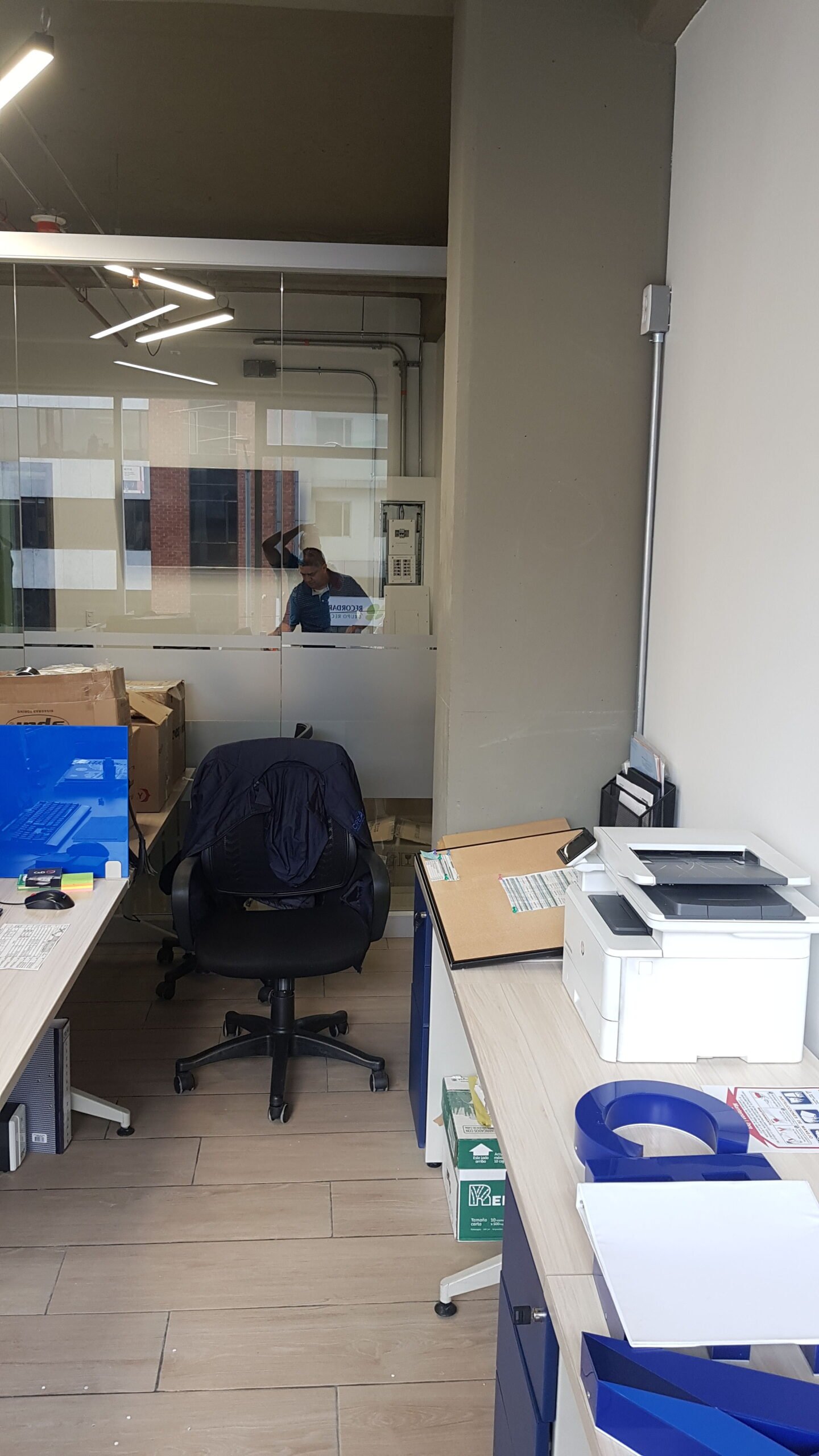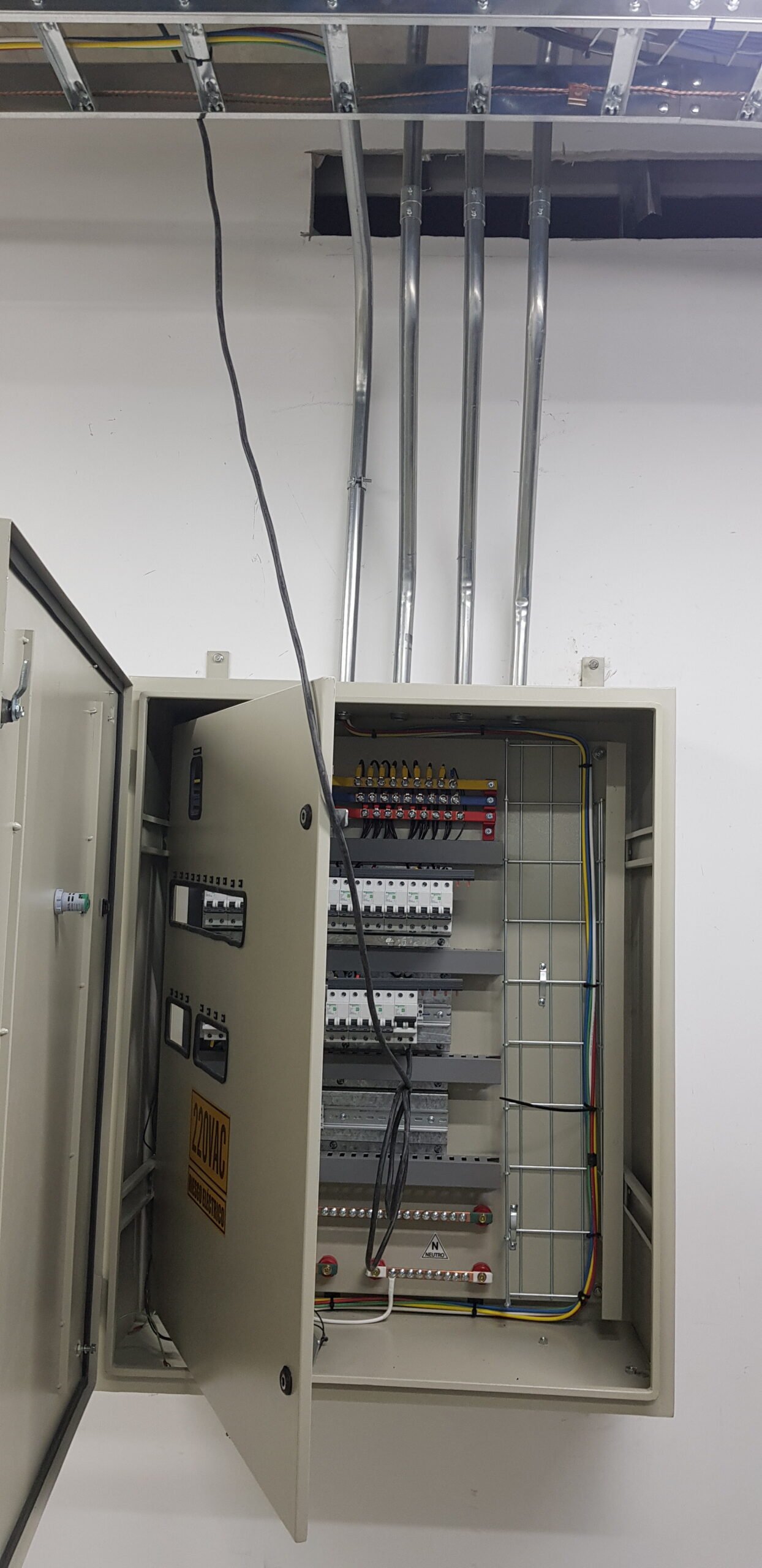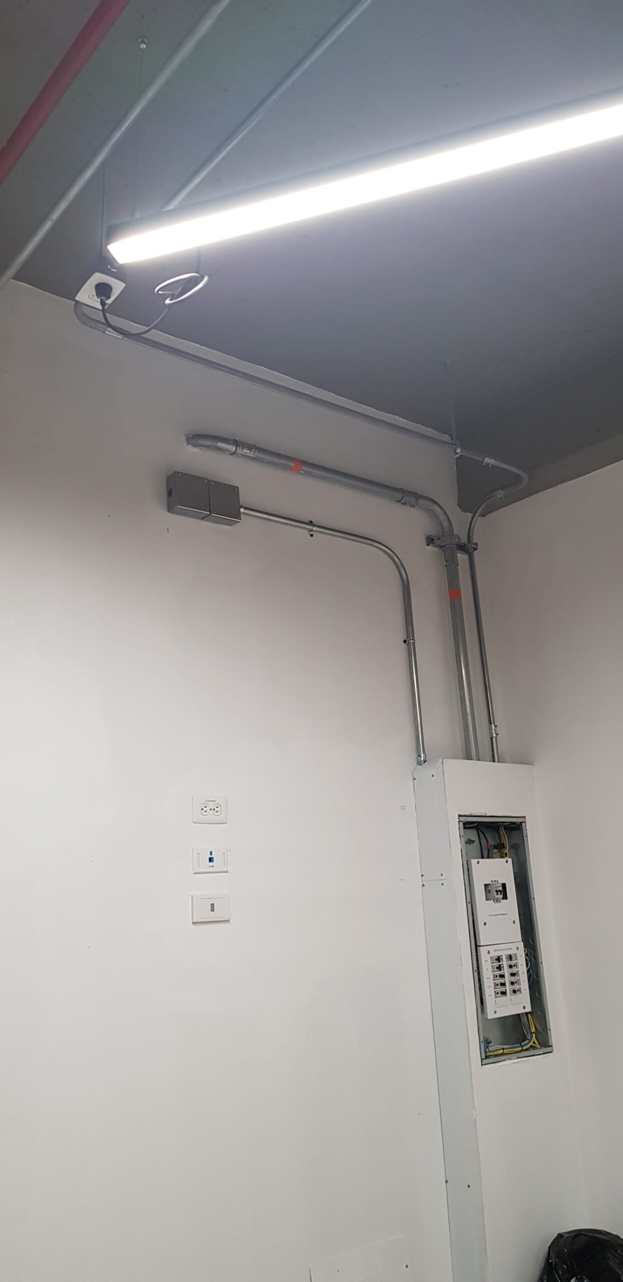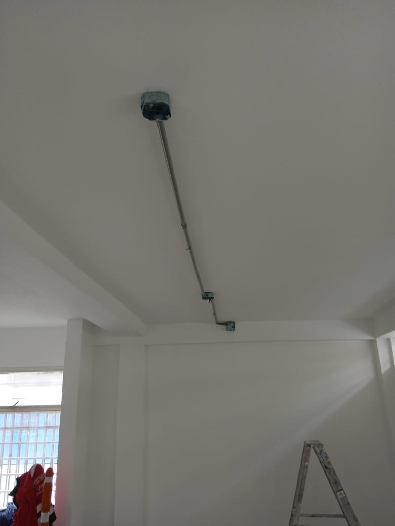 Adecuación eléctrica para entorno comercial, con instalación de canalización visible, soportes metálicos, cajas de paso y luminarias tipo LED. Se garantizó orden visual y eficiencia operativa en zonas de atención al público y oficinas.
